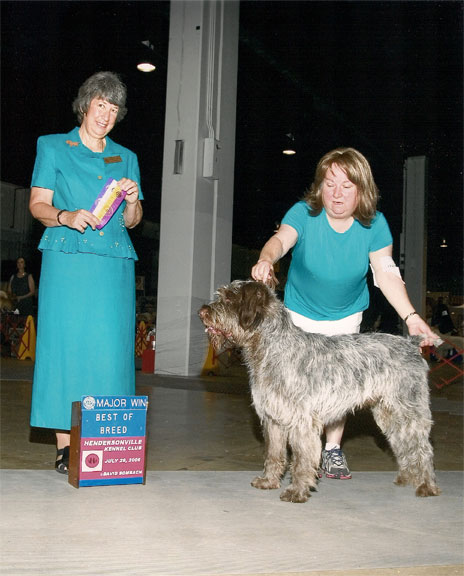 Long missing from our web page is our man in Finland, Wet Acres Gold Standard, owned by Christina Carpelan and Ted and I. “Kuti” flew to Finland with his then dad, Janne Sumusalo, as a 12 week old puppy, and became a presence in Finland as soon as he came on the show scene with his mom, Christina Carpelan. He has accumulated a number of titles and “firsts” along the way. His titles are Junior Winner, 2000, Winner 2000, 2001 and 2002, as well as Nordic Winner 2001 and 3004, and European Winner 2003. He won the Reserve CACIB at the 2002 World Show in Amsterdam where I was able to visit with Christina, Kuti and Pati, his wonderful Griff kennelmate. His “firsts” are notable - “Kuti” was the first Griffon to earn a Puppy Best In Show and also the First Griff to earn a Group I in the Pointing Dog Group (Group 7). Most recently, he was invited to his Third champion of champions show, an invitation only competition limited to the top 100 show dogs (all-breed) in Finland. Christina is now concentrating on field trials with this great boy and hunts him regularly. “Kuti’s” parents are Dam: Wet Acres Absolut Aplombm, now owned by Mike and Elizabeth Gannon, and Sire: Ch Fireside’s Hot Stuff, the latter owned by Rob Gerity and Wendy Gerity of Flatbrook fame. We are fortunate to have been able to place this wonderful dog in an equally wonderful home. |